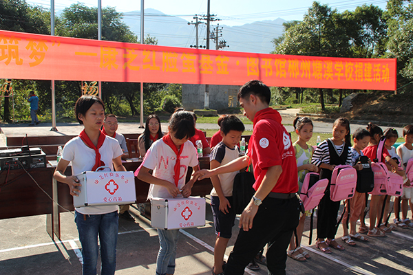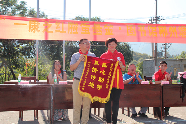 活動現(xiàn)場,陽光燦爛,孩子們的笑臉與陽光相映,閃耀著兒童獨有的天真明媚。志愿者們熱心公益能得到心靈上的滿足,公益力量也為山區(qū)學校提高辦學質(zhì)量提供條件,這是互惠的過程。正如康芝藥業(yè)華南大區(qū)經(jīng)理張春紅女士的致辭:“康芝紅臉蛋基金致力兒童慈善事業(yè),關(guān)愛貧困兒童成長,在提供多種形式援助的同時,也是在推動社會和諧發(fā)展?;疬€將持續(xù)性地為塘溪學校提供愛心關(guān)懷和援助,號召更多的愛心人士幫助孩子們健康快樂成長?!敝驹刚邆儙砹私虒W物資,改善孩子們的學習條件。隨后舉行了“愛心共建學校”牌匾贈送儀式和“紅臉蛋圖書館”揭幕禮,校長回贈錦旗答謝康芝善舉。