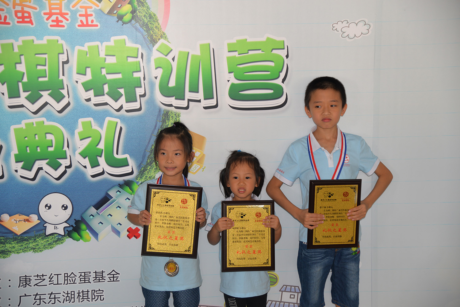 當天的對弈積分賽中,小學員們初露頭角。對弈過程遵守圍棋禮儀,舉棋落子間運籌帷幄,已頗有小棋手風范。綜合兩輪對弈賽的積分,最終排名前十位的小學員分別獲得了金、銀、銅牌。根據(jù)孩子們三周以來的表現(xiàn),特訓營還評選出了“禮儀之星”、“飛躍之星”和“明日之星”各四名,現(xiàn)場由嘉賓為獲獎學員頒發(fā)榮譽獎牌。