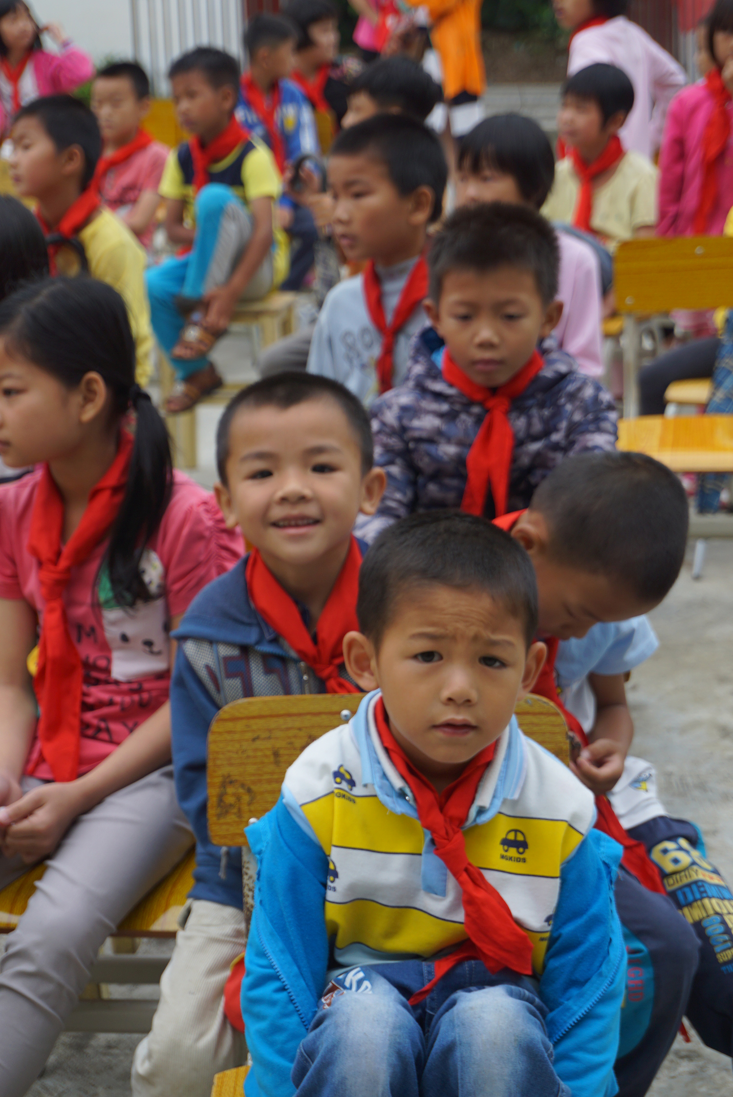 學(xué)校學(xué)生為遠(yuǎn)道而來的小客人戴上紅領(lǐng)巾,并相互握手問好。