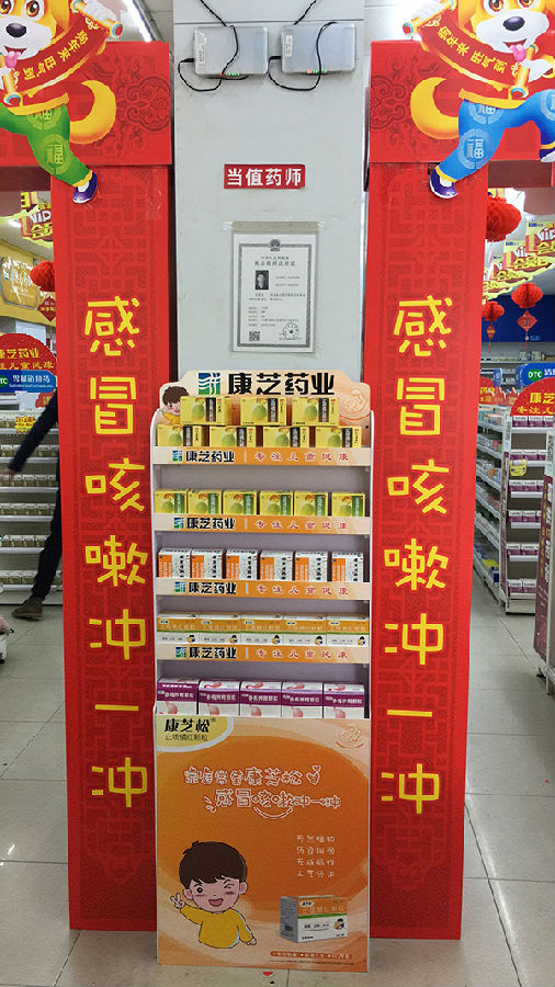 形象店的展示臺(tái)上,有序擺放著康芝松?止咳橘紅顆粒、度來林?鞣酸蛋白酵母散、金立爽?氨金黃敏顆粒等康芝兒藥系列產(chǎn)品。