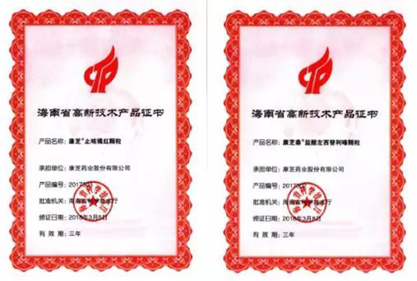 近日,康芝藥業(yè)研發(fā)生產(chǎn)的精品鹽酸左西替利嗪顆粒(康芝泰?)和止咳橘紅顆粒(康芝?),榮獲海南省高新技術產(chǎn)品榮譽證書,充分肯定了康芝藥業(yè)近年來在產(chǎn)品研發(fā)及技術創(chuàng)新領域的成績。