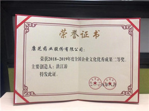 2019年8月5日,由中國企業(yè)聯(lián)合會(huì)、中國企業(yè)家協(xié)會(huì)主辦的全國企業(yè)文化年會(huì)在京召開。大會(huì)表彰了2018~2019年度全國企業(yè)文化優(yōu)秀成果,康芝藥業(yè)榮獲二等獎(jiǎng),康芝藥業(yè)董事長洪江游先生榮獲優(yōu)秀成果主要?jiǎng)?chuàng)造人獎(jiǎng),康芝藥業(yè)海南總廠總經(jīng)理高洪常先生榮獲優(yōu)秀成果參與創(chuàng)造人獎(jiǎng)。