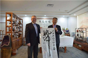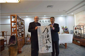 隨后,洪江游董事長與專家們前往茶藝室品酒暢談,并向Jusko教授、Mager教授贈送了書畫作品。