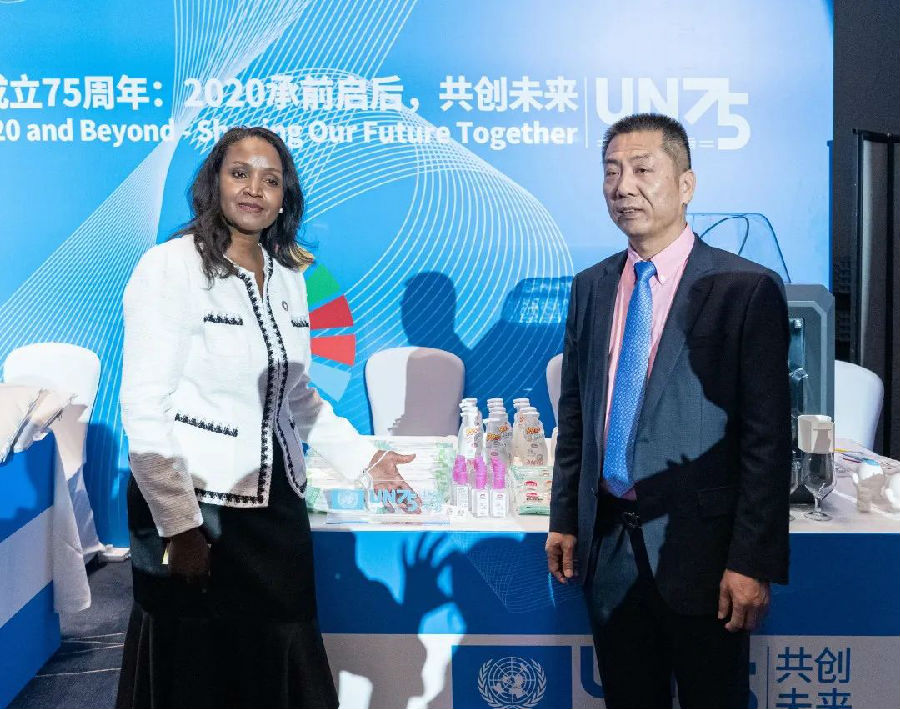 (圖為聯(lián)合國(guó)代理駐華協(xié)調(diào)員桑愛玲女士與康芝藥業(yè)董事長(zhǎng)洪江游先生 )