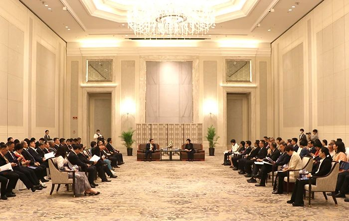 海南省委常委、統(tǒng)戰(zhàn)部部長苗延紅會見連小敏及僑商代表一行,康芝藥業(yè)洪江游董事長作為僑商代表交流分享