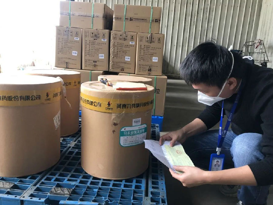 工作人員正在清點(diǎn)剛運(yùn)抵倉庫的原料藥。