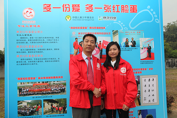 2011年12月27日,“康芝紅臉蛋基金”愛(ài)心家訪(fǎng)團(tuán)前往廣東普寧市洪陽(yáng)鎮(zhèn),此次探訪(fǎng)行動(dòng)受到了社會(huì)各界的關(guān)注和支持。由奧運(yùn)跳水冠軍勞麗詩(shī),汕頭市關(guān)工委主任張第高,普寧市政協(xié)副主席黃增權(quán),康芝藥業(yè)董事長(zhǎng)洪江游,媒體記者,康芝藥業(yè)員工和志愿者組成的愛(ài)心家訪(fǎng)團(tuán)探訪(fǎng)了金鋒小學(xué)以及當(dāng)?shù)氐呢毨Ъ彝?,給孩子們送上關(guān)懷和禮物。