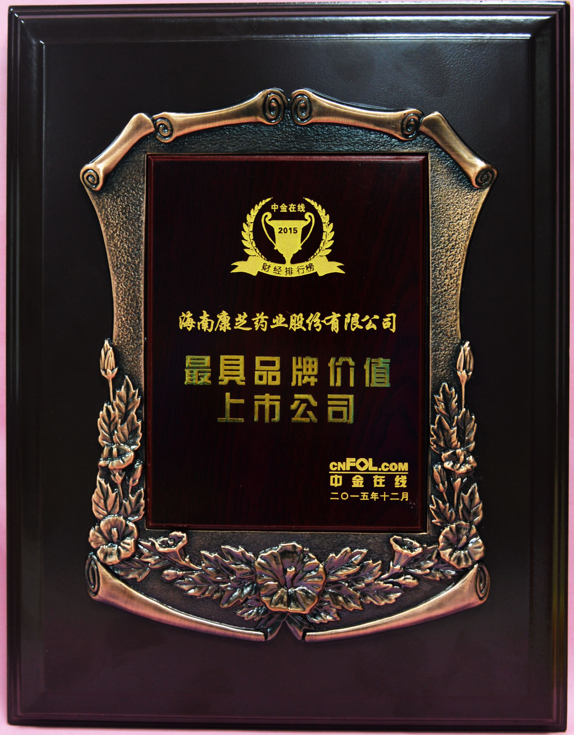 康芝藥業(yè)獲評“2015年度最具品牌價值上市公司”