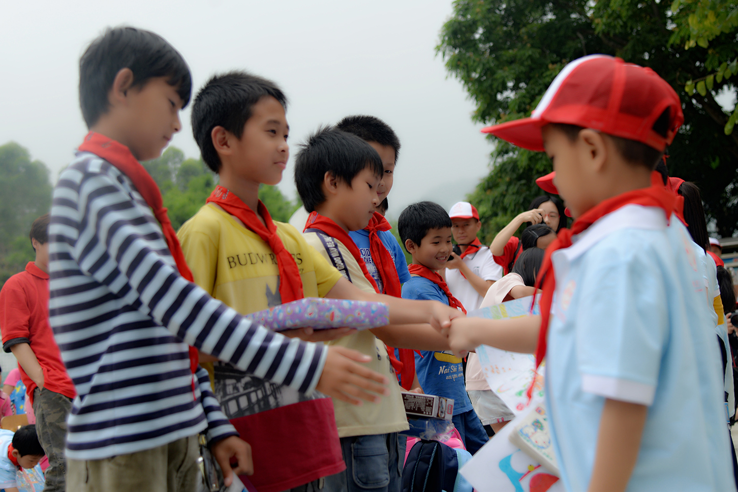學(xué)校學(xué)生為遠(yuǎn)道而來的小客人戴上紅領(lǐng)巾,并相互握手問好。