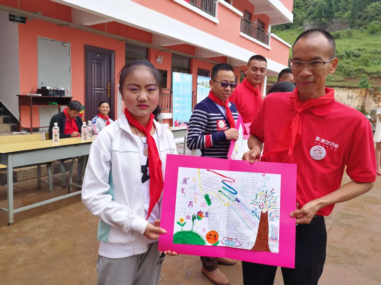 康芝藥業(yè)云南省區(qū)經(jīng)理袁代松、康芝藥業(yè)云南合作伙伴曹喜勝,和來自云南銘俊藥業(yè)有限責任公司、云南彝頌文化傳播有限公司、富源縣旺家樂健康藥房的一眾愛心人士,以及云南曲靖市富源縣后所鎮(zhèn)中心學校肖松老師、阿依諾小學全體師生一同出席了捐贈儀式。