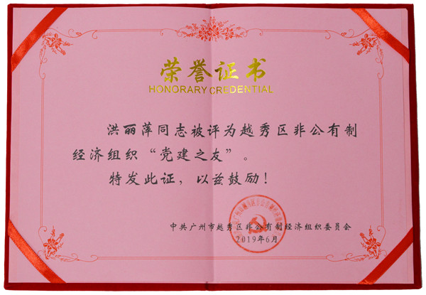 為樹立典型,弘揚先進,進一步推進非公有制經(jīng)濟組織健康發(fā)展,推進非公有制經(jīng)濟組織黨建工作,在紀念中國共產(chǎn)黨成立98周年之際,廣州市越秀區(qū)非公有制經(jīng)濟組織黨委在非公有制經(jīng)濟組織中開展“黨建之友”評選活動,康芝藥業(yè)副董事長兼副總裁洪麗萍同志榮獲越秀區(qū)非公有制經(jīng)濟組織“黨建之友”榮譽稱號。