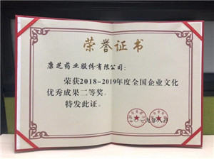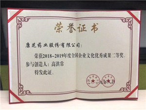 2019年8月5日,由中國企業(yè)聯(lián)合會(huì)、中國企業(yè)家協(xié)會(huì)主辦的全國企業(yè)文化年會(huì)在京召開。大會(huì)表彰了2018~2019年度全國企業(yè)文化優(yōu)秀成果,康芝藥業(yè)榮獲二等獎(jiǎng),康芝藥業(yè)董事長洪江游先生榮獲優(yōu)秀成果主要?jiǎng)?chuàng)造人獎(jiǎng),康芝藥業(yè)海南總廠總經(jīng)理高洪常先生榮獲優(yōu)秀成果參與創(chuàng)造人獎(jiǎng)。
