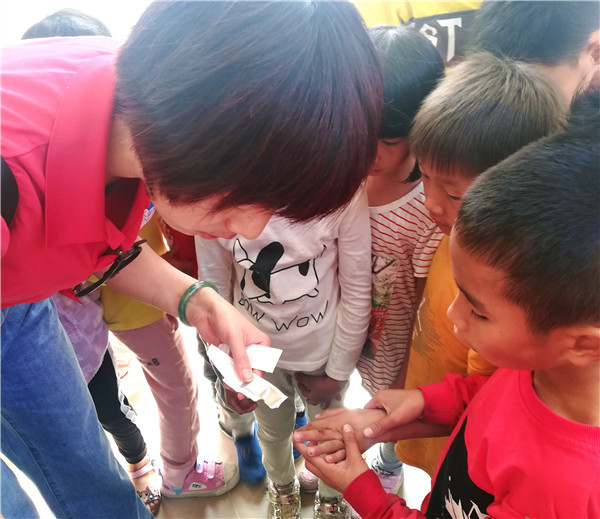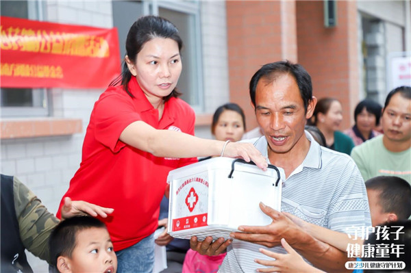 △志愿者現(xiàn)場(chǎng)為家長(zhǎng)發(fā)放愛(ài)心藥箱