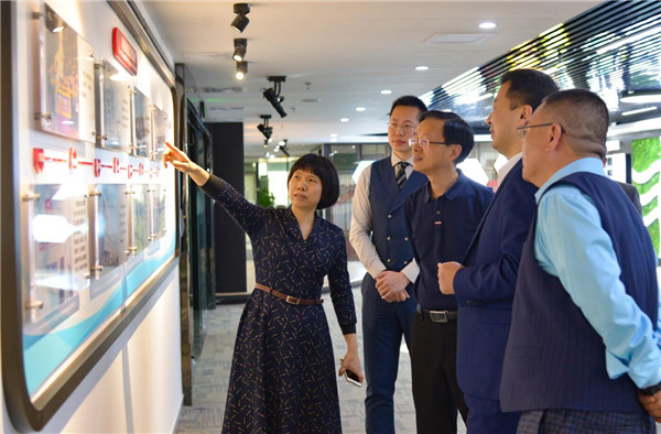 △康芝藥業(yè)副董事長(zhǎng)兼副總裁洪麗萍(左一)向廣州市科學(xué)技術(shù)局局長(zhǎng)王桂林(左三)一行介紹康芝情況