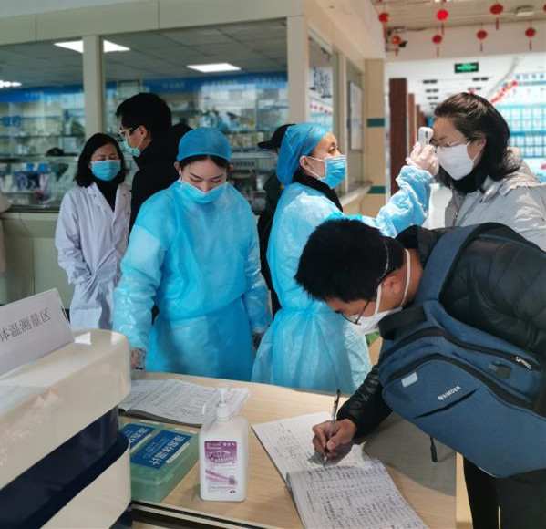 醫(yī)院嚴格按照疫情防控要求,將員工通道與患者通道分開,患者從門診大廳進入醫(yī)院,而醫(yī)護人員從側門進入醫(yī)院,不管是正門還是側門,都設立了發(fā)熱預檢點。醫(yī)護人員24小時值班,嚴防死守,不漏一人,對進入醫(yī)院的患者及家屬,醫(yī)護人員、后勤人員等在內的所有人員進體溫測量,及時識別可疑病例,做到“早發(fā)現、早報告、早隔離、早治療”。