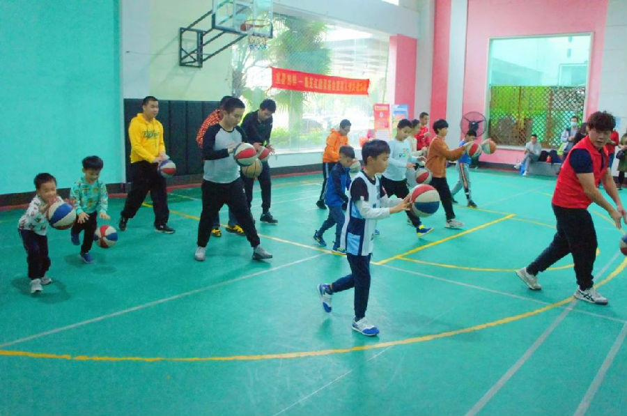 講解完畢,孩子們就已經(jīng)開(kāi)始躍躍欲試。活動(dòng)伊始,孩子們嘗試著于他們而言新穎的籃球游戲。因?yàn)閺奈唇佑|過(guò)籃球,他們尚未完全掌握游戲的要領(lǐng),動(dòng)作也比較生疏,但是在一眾家長(zhǎng)和志愿者的鼓勵(lì)與幫助下,孩子們大汗淋漓地游玩著,用心地對(duì)待每一個(gè)游戲環(huán)節(jié),歡笑不斷,嬉笑玩鬧著,現(xiàn)場(chǎng)洋溢著幸福滿足的氣息。球場(chǎng)上孩子們跑動(dòng)的身影、童真的笑容,仿佛黑夜中星星般的光芒,讓我們?nèi)滩蛔∨南抡掌?,留住這一刻難得的美好。