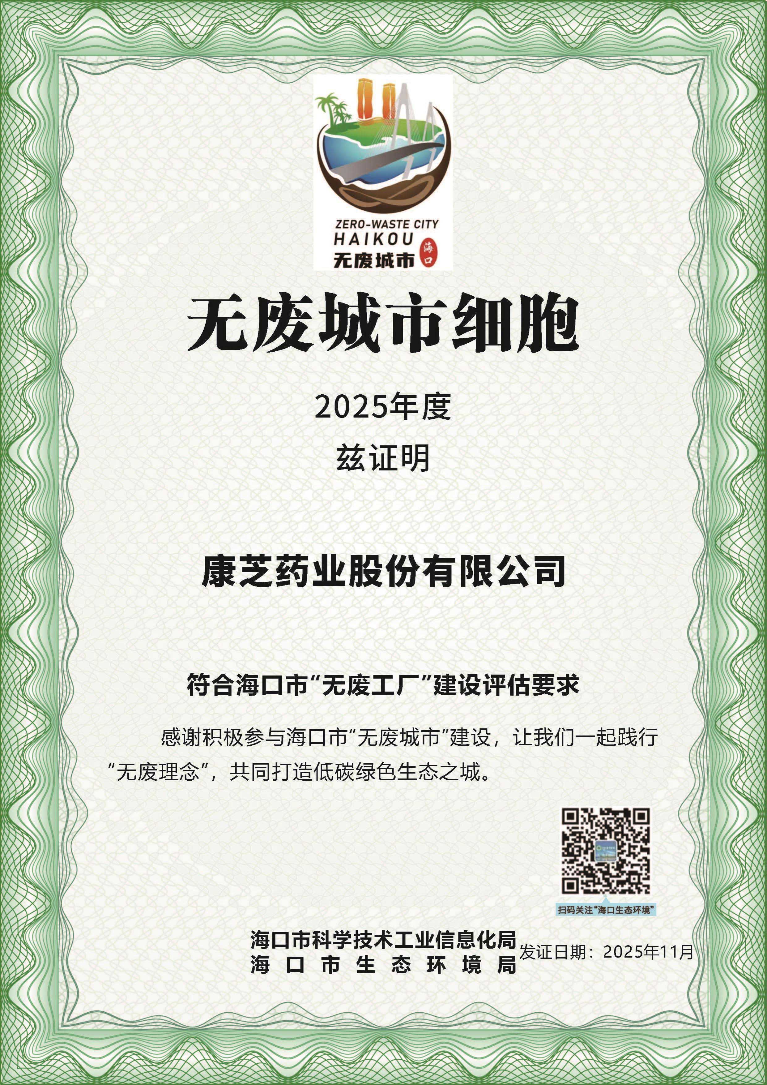 2025年11月10日,康芝藥業(yè)收到??谑锌茖W(xué)技術(shù)和工業(yè)信息化局、??谑猩鷳B(tài)環(huán)境局聯(lián)合頒發(fā)的??谑?ldquo;無(wú)廢工廠”證書。這是繼今年9月被海南省工業(yè)和信息化廳認(rèn)定為“海南省綠色工廠”后,公司在綠色生產(chǎn)和可持續(xù)發(fā)展領(lǐng)域的成果再度獲得權(quán)威認(rèn)可。