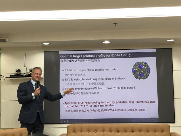 2015年,康芝藥業(yè)引進中法合作中科院上海巴斯德研究所的“治療病毒疾病的成分和方法”專利技術(shù),著力研發(fā)兒童手足口病專用抗病毒藥物注射用蘇拉明鈉,Ralf Altmeyer教授作為發(fā)明人參與其中。近日,康芝藥業(yè)全資子公司收到國家藥品監(jiān)督管理局下發(fā)的“注射用蘇拉明鈉”藥物臨床試驗批件。如果臨床試驗成功并獲許生產(chǎn),蘇拉明鈉將成為全球首個治療手足口病的新藥。